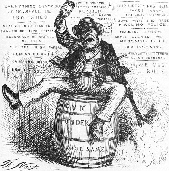 By then, for over half a century - since the Irish Potato Famine of 1845-1849 - Irish Americans faced a deluge of nativist, fear-bound discrimination borne of fever-dream conspiracy theories. They were called “Black Irish,” a term of uncertain origin but with certain intent to demean and dehumanize. They struggled to get good jobs, with offers often carrying the caveat “No Irish Need Apply.” Irish were popularly and publicly caricatured as sub-human beasts, prone to violence, criminality, and incessant drunkenness. The xenophobic (and aptly-named) “Know Nothings” were certain an Irish Catholic papal conspiracy existed to establish a new Vatican in Cincinnati, Ohio (see page 413). The Irish were often seen as little more than garbage.